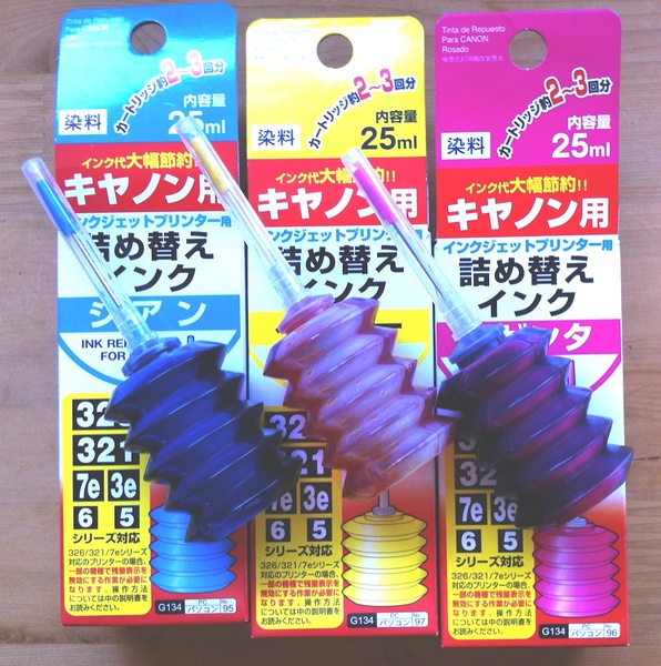 「虹色のバラ」と「国際特許というハッタリ」で書いたように、染料を混ぜた水に切り花を挿すと、花は色はその染料の色に染まります。染料というのは、簡単に水に溶くことができるような、たとえば数十ナノメートル程度の大きさの小さい色材です。植物が水を吸い上げていく細胞膜の穴は数十ナノメートルから百ナノメートル程度の大きさですから、植物が水を吸い上げようとすると、水に溶けた染料も植物の細胞を自由自在に通り抜け、花びらの先までたどり着くというわけです。だから、染料インクを使うインクジェット・プリンタ用詰め替えインクに切り花を生けると、花はその色に染まります。