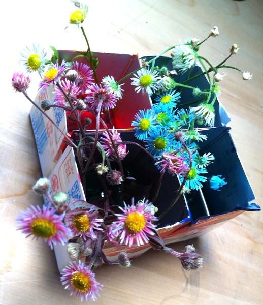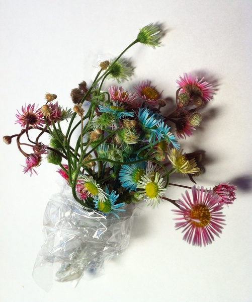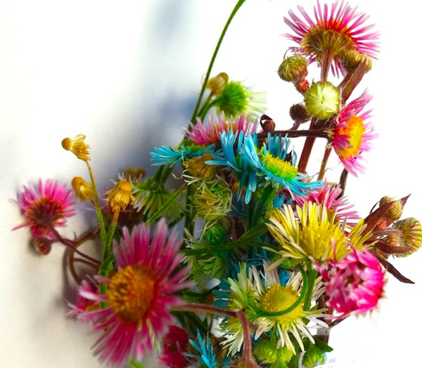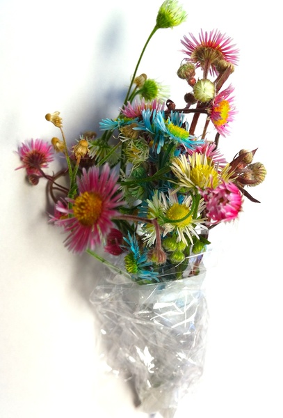 右の写真は、100円ショップのダイソーで買った「詰め替え染料インク」にヒメジヨンを生け、花にインクを吸い上げさせることでカラフルに染め・作り上げた「小さなカラフル花束(ブーケ)」です。色とりどりカラフルに見えるこの花束は、実はすべて白いヒメジョンで、「ヒメジョンをシアン・マゼンタ・イエローの三色のインク(とシアンとイエローを混ぜ作り上げたグリーンのインク)に生ける」ことで作り上げたものです。