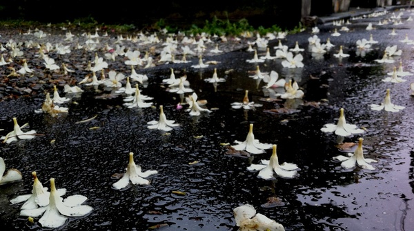 台風が近づく雨の中、道路の上に白く大きな花がたくさん落ちていることに気づきました。興味深いことに、その白花はほぼすべてが下向き、俯(うつむ)くようにして落ちていました。雨に濡れた路面に落ちる数多くの白くて大きな花を写真に撮ったのが、下の写真です。たくさんの花びらが、ほぼすべての花びらが、花びらを下に向けて落ちている・茎を空に向けて落ちていることを少し不思議に感じる風景です。