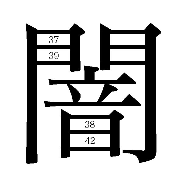 試しに、ヒラギノ明朝で「闇」という字を描き、門構えと音という部分、つまり「3本の横線が引かれている部分」を眺め・横線の間の感覚を計ってみると、確かに3本線の真ん中に引かれた線は少し上に寄っています(横線の間に間隔比を数字で表してみました)。数字を眺めてみると、おおよそ5パーセントほど「中央線」が上に寄っていることがわかります。