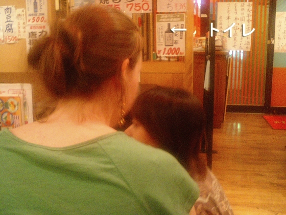 …そして、興味を持つだけではなく、実際に店で働いている若い男性をアメリカ人女性が横に呼びつけて、ついには尋ね始めたのです。「スミマセンガー、アノー、トイレーにあるコオリはナンノタメー?デスカー?」すると、男性店員は照れながらも(以前書いたような)「すこしづつ溶ける氷が便器の汚れを防止している」「氷が清涼感を与える」といった理由を説明してくれました(右の写真は、質問された若い男性が奥に戻ってから、若い女性に顛末を話しているところ)。そんな説明を聞き、一瞬は納得したようでしたが、すぐに興味津々のガイジンたちは「何で男性のトイレにだけ清涼感を提供するの!?」と疑問をまだまだ展開させているのです…。
