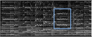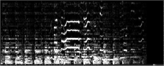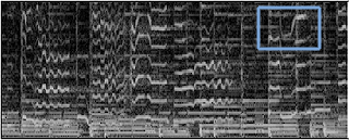 また、それぞれのスペクトログラムの音の出し始め部をよく眺めてみるとちょうど「√」の形をした部分が数多く見られることに気づく。上に示した、竹内まりやの「元気を出して」のスペクトログラム中で青い矩形で囲った部分を見れば、そんな「√」形の部分があることが判るだろう。この「√(ルート)」形状は、「音の高さが連続的に変化している(一種のポルタメントのように)」ことを示しているわけだけれど、そんな√形状が竹内まりやと山下達郎の局の中に多いことが特に判りやすい部分を示したのが下のスペクトログラムだ。二人の歌の中にとてもよく似た√(root)マークがある(そして実はそれがとても数多くある)ことが判ると思う。