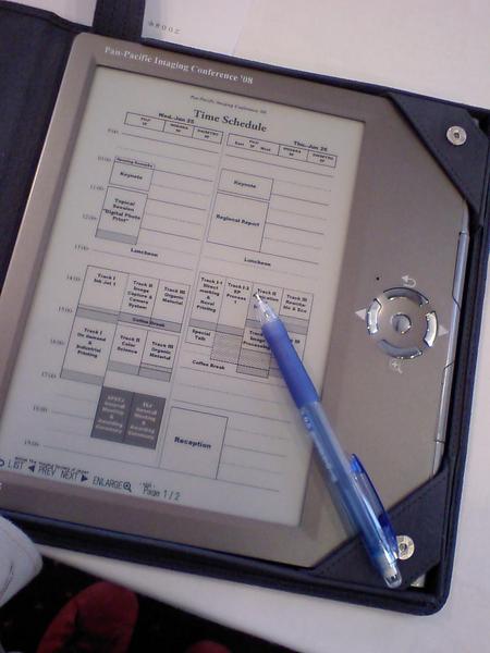 東海大学とブラザー工業が提供する電子ペーパーを試用する機会があった。A4より少し小さく、十字キー+中央ボタンという入力インターフェースを持ち、厚さは5mm程度で、非常に薄く感じた。