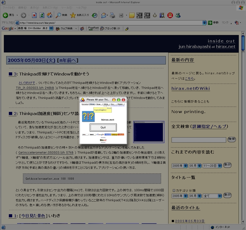 Tilt_It というわけで、ついでに作ってみたのが「Thinkpadを傾けるとWindowが動くアプリケーションTilt_It.050503.lzh 248kB)」Thinkpadを左へ傾けるとWindowが左へ滑って移動していき、Thinkpadを右へ傾けるとWindowは右へ滑っていきます。もちろん、奥へ傾ければ上へと上がっていきますし、手前に傾けると下へ落ちていきます。右の画像内で、ブラウザ画面の前にある小さなWindowがありますが、そのWindowがThinkpad自身の傾きと連動して動くようになっています。
