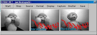 このpurikura.exeの動作画面はこんな感じだ。ビデオ画像が白黒なのは、白黒のCCDカメラを使用したからで、カラーのビデオカメラを使えば、むろんカラーで写るはずである。![]() |