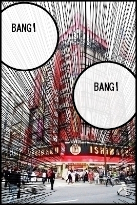 ワイドレンズ・カラー木版画・集中線・吹き出しの組み合わせ例