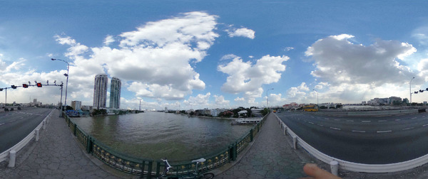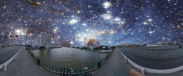 そこで、普通にやりそうなコードを書いてみたら、空領域抽出がどのくらいの品質が得られるか、確かめてみることにした。手っ取り早く試してみたいというわけで、Python/OpenCVコードを書いてみた。このコードは、入力画像と(入れ替え用の)空画像を読み込んで、グラフカットアルゴリズムが実装されたOpenCVのGrabCut関数を使い、(空がある程度の面積を占めていそうな)画面上半分の領域を対象として空領域を抽出し、その領域に空を合成するという処理を行うものだ。その処理例が、たとえば下に貼り付けた「バンコクの昼風景を夜空の下の街に入れ替えた画像」のようになる(上が入力画像、下が出力画像)。