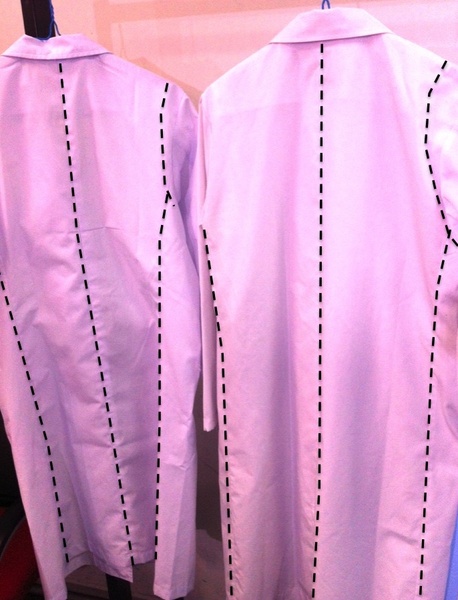 たとえば、右の写真は女性用白衣(9号)と男性用白衣(Mサイズ)を、フォルムがわかりやすいように、生地の繋ぎ目に点線をひいた上で、並べてみたものです(左側:女性用9号、右側:男性用Mサイズ)。そうしてみると、男性用白衣は肩から足下までほぼ同じ幅でストンと伸びたフォルムになっているのに対して、女性用白衣は胸からウェスト部分にかけて”ずいぶん絞られた”形になっていることがわかります。