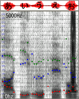 それでは、「英語スピーキング科学的上達法」に付属のソフトで私のフォルマントを調べてみる。これが私の「あいうえお」のスペクトログラムとフォルマントである。
