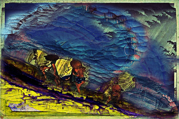 そこで、今日は歌川広重の東海道五十三次「庄野」を刷った版木の彫り跡を重ね合わせて、「一枚の絵画」にしてみました。画の流れに沿って流れるように筆を運ぶゴッホの画のような風景が、広重の版木から浮かび上がってくるかもしれない…と感じたりします。