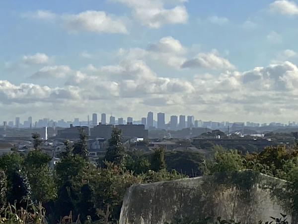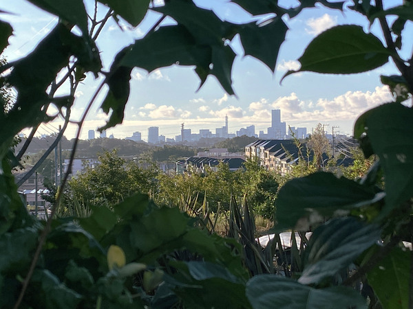 ひとたび、こんな山脈縦断コースに出たら、後は自動的に興味深い色んな風景に、自動的に出会うようになります。たとえば、右の写真のように、横浜のみなとみらい……つまりはかつての未来的な風景が、ベットタウンな住宅地の隙間から見えてきたりもします。