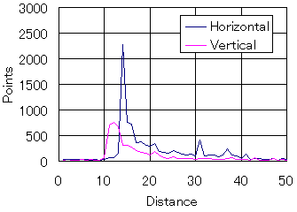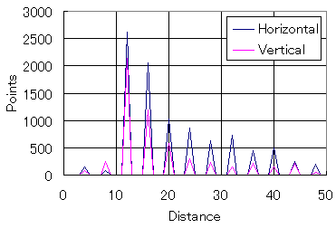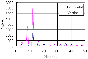 まずは、600dpiで20ptのMS Pゴシックのフォントを展開して上のような画像にした後に縦・横方向のそれぞれの解像度を考えてみる。ここでは、縦・横方向の黒い線(あるいは線でない部分)の太さ(幅)の分布を測ってみることにした(今回解析のために作成したソフトはここ(RunLength.lzh)においておく)。テキストのような二値の画像の「解像度特性」を計測するのであれば、このような解析にしなければならない。「ファイト!縦文字文化 -縦と横の解像度を考えよう - (2001.04.29)」でやったようなフーリエ解析は適切な方法ではないのである。