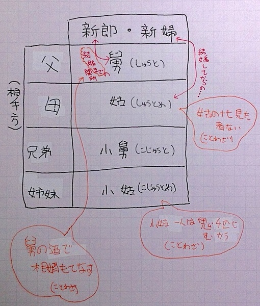 そんな悩みを減らすため、「婿・嫁・姑・舅・小姑・小舅」といった言葉について、意味やそれらのキャラクタたちの関係を図示し、さらにや関係する「ことわざ」も書き入れてみました。