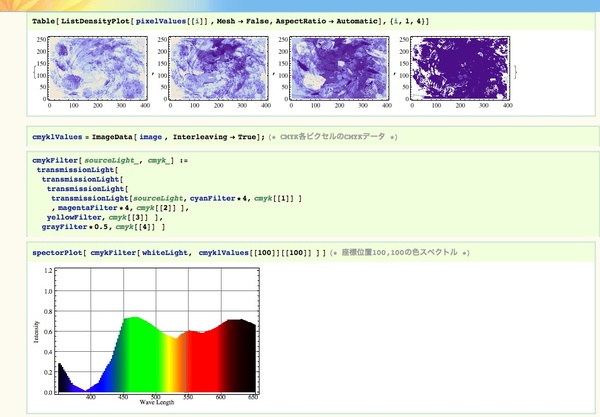 Mathematicaで色(スペクトル)計算をしたり、計算結果を表示するのに便利な関数を(ほんの少しだけ)作り直しました(ColorImagingFunctions.txt)。CMYKの画像ファイルを開き、「画像のこの辺りのピクセルは、一体どんな色(スペクトル)になるんだろう?」なんていう計算をする時の「叩き台」になるかもしれない(ならないかもしれない)という、そんな関数群です。