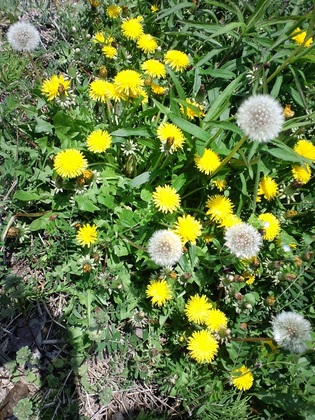 昼間、道を歩いているとタンポポの花が満開に咲いていた。思わず、太陽の光の下で黄色に輝くタンポポの一群を写真に撮った。