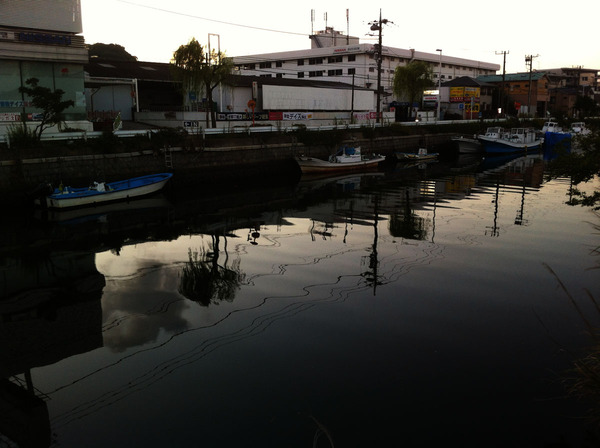 横須賀街道の磯子橋近くで川を眺めてみると、水面に映る電線の姿が水の表面形状を限りなくわかりやすく伝えてくれていることに気づきます。…そんなことを考えていると、小船が素早く通り抜け水面が掻き乱され…そして、水面が滑らかだったからこそ、(電線の映り込みで)表面形状がわかりやすかったことに気づかされます。