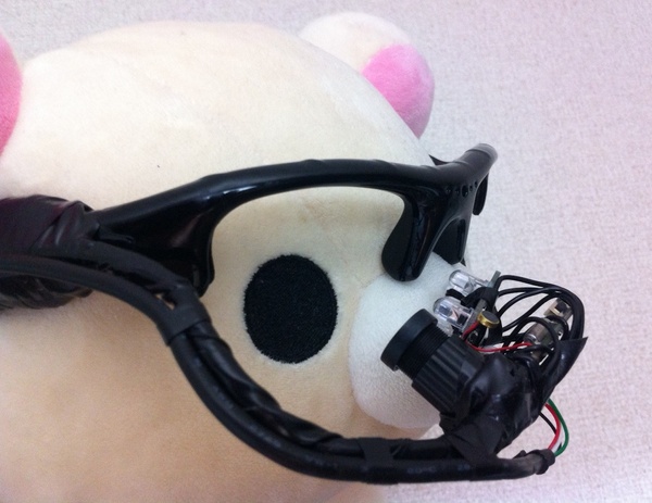 今日作ったのは、「マイ・メガネ」の「視線入力部」です。自分が眺める風景を認識しつつ、その風景の中のどんな場所を眺めるかを検出することもできる、「視線入力装置付きメガネ(眺めている世界をリアルタイム・キャプチャ&録画する装置付き)」です。「自分が眺める風景を認識しつつ」とか「(逐次)眺めてる世界」といったことをわざわざ書いているのは、実に単純な理由です。つまり、(視線計測時には)頭を動かしちゃだめですよ・眺める景色に対して顔を動かしてはいけませんよ、という計測装置が多いからです。…そんな制約条件は不自然だ・あり得ない…と思うわけです。