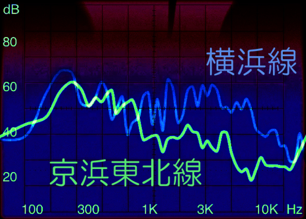 というわけで、耳障りのJR横浜線の車内放送と(そうではなかった)JR京浜東北線の音質の違いを、スピーカーの真下で比べてみた結果が下に貼り付けたグラフです。こうして比較してみると、耳障りな横浜線の車内放送は、1~10kHzの高周波帯が大き過ぎ(歪みによる高調波が発生し過ぎ)のような気がします。ハイファイ高音質にする必要は無いにしても、ここまで歪ませなくて良いような気がします。