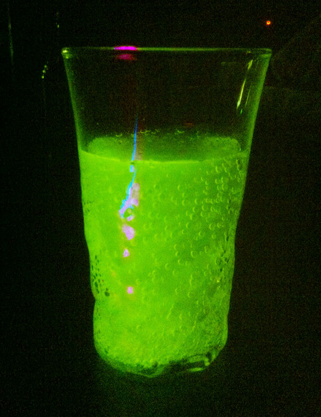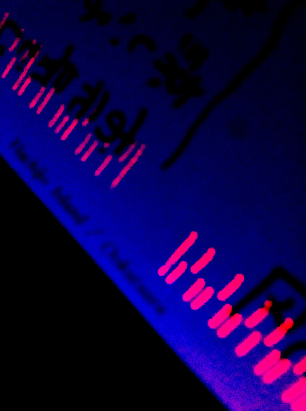 まずは、疲れに効きそうなデカビタCをビタミンB2パワーで光らせて(定番=オロナミンCより容量が多いという理由でビンボな人はデカビタCを選ぶ!)、軽い財布の中にある貴重な千円札に印字されてる「秘密文字」を浮き上がらせて、郵便バーコードを眺めてみたり…という、紫外線による家宅捜索をしてみました。
