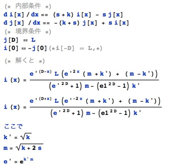 この連立微分方程式は(連立微分方程式とはいっても)i(x)とj(x)は原点対称の「実は同じもの」ですから、結局のところ、普通の微分方程式です。そうした媒質内部の現象を書いた微分方程式に、ビールグラス境界で「外部からの環境光 L が入ってくる」という境界条件を付けて(あるいは、対称性から原点でi(x)とj(x)が等しいといった境界条件を付けて)、微分方程式を解いてやると、上に書いたようなi(x)とj(x)を表す式が導かれます。
