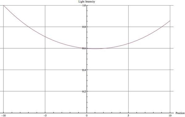 たとえば、右のグラフは(向かって)ビール・グラス右向きに向かう光量=j(x)を、微分方程式を解いた結果から示した一例です(横軸は位置, 縦軸は光量)。向かって左側はグラス外側から環境光が入射するため(右側に向かう)光量が多く、グラス右側では(主にグラス右側から入射した光が)散乱により方向を変えて・右側に進む光が一定量あることなどがわかります。
