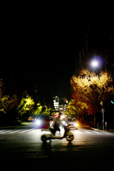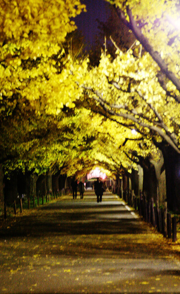 三島駅近く。銀杏並木を飛ばすと、とても大粒の雪のように銀杏の葉っぱ達が降ってきた。だから、写真の中でまるで雨のように見えている黄色いモノはそれは銀杏の葉っぱなのである。とても綺麗だ。