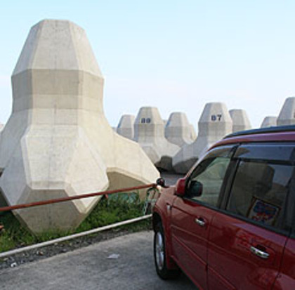 右の写真はテトラポッドです。近くに停まっているRV車と比べて眺めてみれば、ずいぶんと大きいことがわかると思います。高さは…、ちょうど5mくらいありそうです。この巨大なテトラポッドは静岡県 富士市近くの田子の浦海岸に置いてありました。なんと、(テトラポッドに書いてある番号を眺めてみると)二百個近く並んでいるようです。テトラポッドが並ぶ景色は、とても壮大でもあり、何だか少し不思議でもあります。
