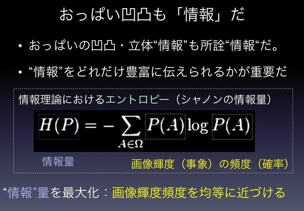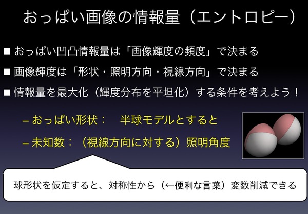 実は、情報理論を使うと「バストの魅力を最大限に引き出すための光の当て方・陰影の付け方」を導き出すことができます。「バストの凹凸」も所詮は「情報」に過ぎないので…バストを映し出す・描き出した画像の「情報量(エントロピー)」を最大化する問題として捉えてみるわけです。