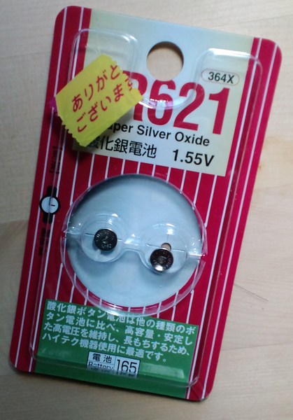 そして、腕時計に入っていたのと同じタイプの電池(今回はSR62という具合の型番の電池でした)を100円ショップに買いに行きました。ちなみに、行ったのはダイソーです(セリアにはありませんでした)。すると、同じようなタイプの電池が何種類かあったので、2個で100円のものを買いました。