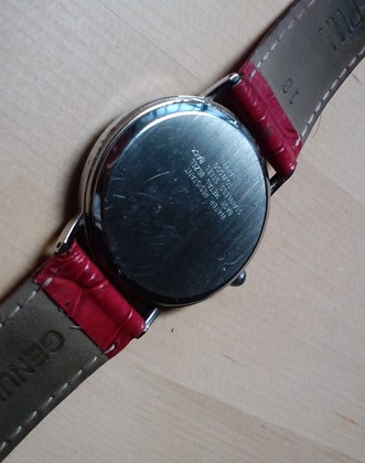 裏蓋が「ネジ式」の腕時計といのは、裏蓋の周囲に何箇所かの凹部があり、その部分に道具を引っかけて裏蓋を回すことで、裏蓋を開けるタイプの腕時計です。たとえば、右上の腕時計は、そんな裏蓋がネジ式になっている腕時計です。この腕時計も電池切れで止まってしまいました。