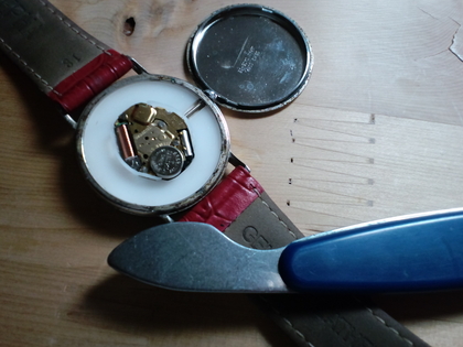 まずは、腕時計を開けてみます。止まった腕時計は裏蓋が「はめこみ式」というもので、本当にただ蓋がはめ込まれているだけのものです。そこで、裏蓋に精密ドライバーを押しあてつつ傷がつかないようにクイッと力をかけてやると、裏蓋がスポッと抜け、時計の裏側部分の電池部分にアクセスすることができるようになります。傷がつかないように、というところが大切です。
