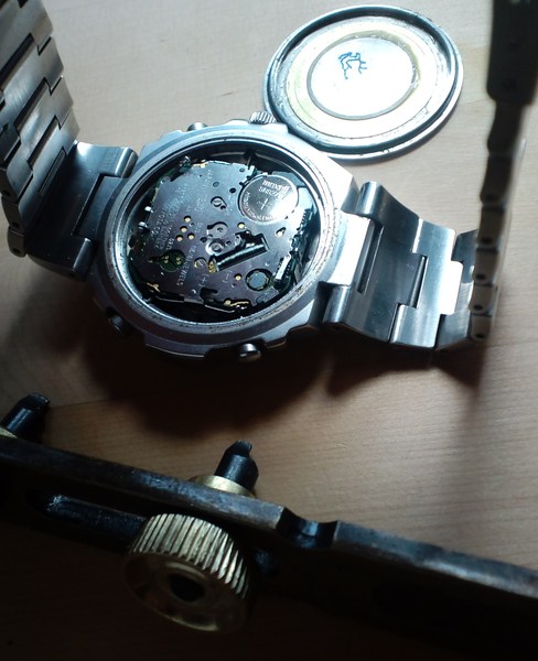 右の写真が、電池切れで止まってしまったネジ式裏蓋腕時計を開けてみたところです。