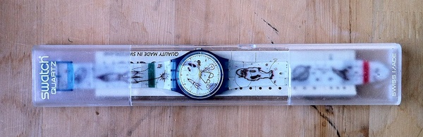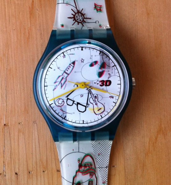 バザーでSWATCHの"3D"腕時計があったので、500円で買いました。新品らしき、けれど電池は切れているという状態でしたが、赤と青の2色で描かれた"3D"という言葉に惹かれ買ってしまいました。