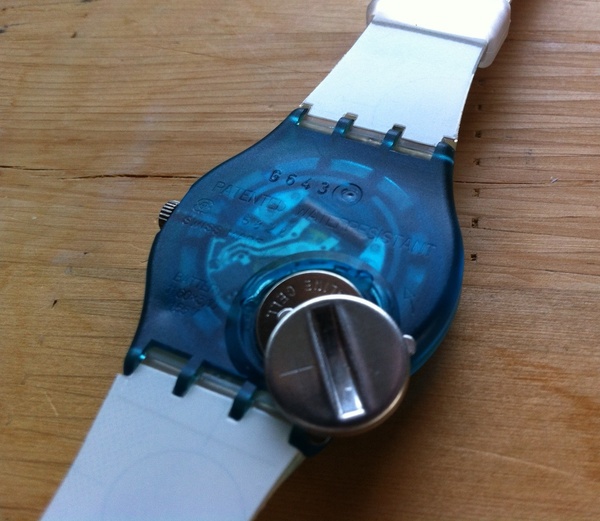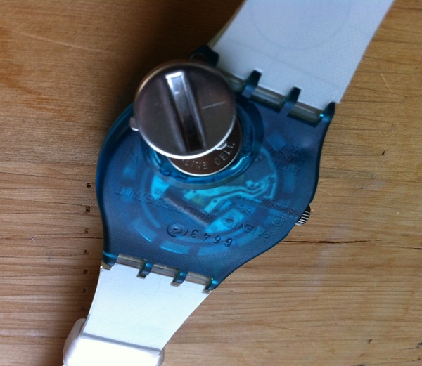 100円ショップのダイソーに行くと、SWATCH腕時計で使われている「1130タイプ」のボタン電池が2個セット100円ナリで売られています。早速1セット買い、腕同型の電池を交換すると(SWATCHは大きいマイナスドライバーを使うと簡単に電池交換用の裏蓋を開けることができます)、”3D”時計の針はチクタク・チクタクと動き始めました。