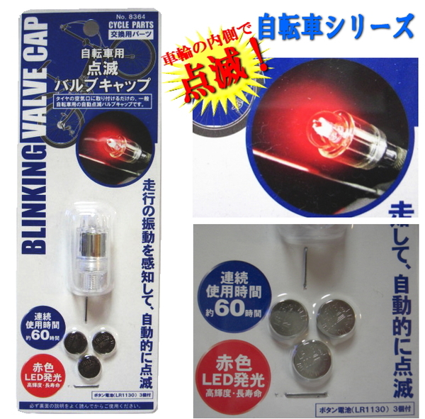 今日、100円ショップのキャンドゥの棚を眺めていると、「自転車用赤色点滅バルブキャップ」というものが売られていました。自転車のタイや空気口に取り付けるとチカチカ赤く点滅し・周りの車などに自分の存在を知らせることができる、という優れものです。これが、なんと「1130タイプのボタン電池 3個付き」で100円で売っているのです。