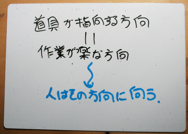 なぜそれが自然かと言うと、多くの場合、道具が指向する方向を、それを使う人は意識するからだろう。その道具が得意な方向に、つまり道具が導く流れの(一言で言ってしまえば楽に作業できる)方向に、人の努力は向かう。だから、「使う道具次第で、作る内容は違ってくる」のだと思っている。