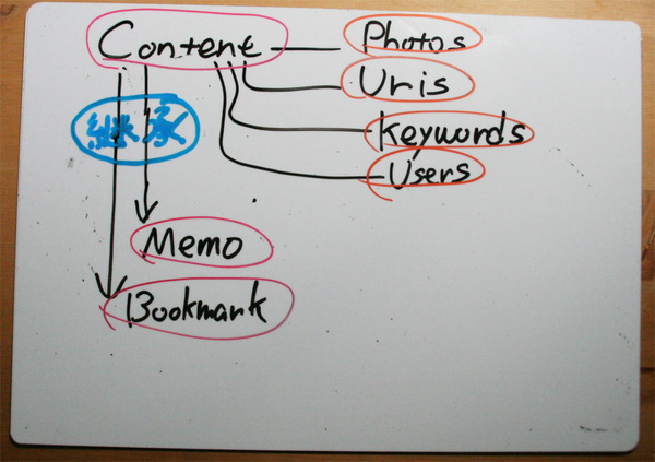 サーバアプリはRailsを使って適当に作った。その構造を大雑把に言えば、画像アップロード・他サイトリンク(リンク先サムネイル作成/全文キャッシュ)などの機能を備えたContentクラスを作り、Contentクラスを継承して、Articleクラス(できるかな?)とMemoクラス(inside out)とBookmarkクラス(現状Tech-logs)があり、それら全てのContentを継承したクラス間をKeywordクラスが(Keywordクラス自身も含め)繋いでいる、という具合である。そういったクラス継承に頼った道具の造り・構造は、Ruby on Railsという道具をさらに使ったためである。(また、デザイン/CSSはtDiary系互換にし、自分でそういった作業をすることは止めた。)