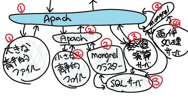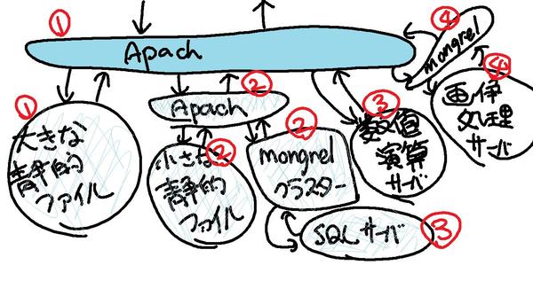hirax.netは現状4台のサーバで動いています。「大容量ファイル配信」「小さな静的ファイル配信」「メインコンテンツ配信用のRailsアプリを動かす mongrelクラスタ」「いくつかの実験サービスを動かすRails アプリを動かすmongrelクラスタ」「SQLサーバ」「各種数値演算用サーバ」「画像処理サーバ」といったもを、それぞれのPCに役割分散することで動いています。役割分散させると管理が面倒なので、いずれは、まったく同じ機能・同じ構成の仮想サーバにでも処理を分散させるようにしたいのですが、なかなか、そんな再構築作業ができないでいます。