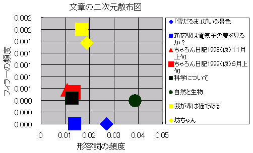 結構、同じ書き手による文章が同じような位置に配置されることがわかると思う。ちゃろん日記(仮)などは、二つの独立した文章がほとんど同じ位置に配置されている。もう、ちゃろん文体は安定しまくっていて完成されているのである。そしてまた、「文豪」夏目漱石の場合も、「我が輩は猫である」と「坊っちゃん」がかなり近い位置に配置されていることがわかる。