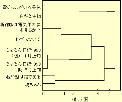 このクラスター分析の結果を示す図は近い文章をまとめていったものを示している。つまり、文章の「近さ」あるいは「似ている度」を示しているのである。ちゃろん日記(仮)の二編は本当によく似ていて、また夏目漱石の書いた二編も互いに似ている。そして、それより「近い度」は低いが「新宿駅は電気羊の夢を見るか?」は「科学について」に近くて、「雪だるまがいる景色」は「自然と生物」に近い。おして、さらに似ているものを探せば、ちゃろんの二編と「新宿駅は電気羊の夢を見るか?」・「科学について」は似ているといえなくもない、さらに言えばその四編と夏目漱石の二編が似ている。