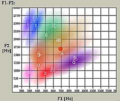 もちろん、別人の声であるから音声波形が異なるのは当たり前だろう。そこで、フォルマントを調べてみることにした。それが下のグラフである。赤丸部分が「あァ〜ン」の秘密を解くポジションである。「あァ〜ン」のフォルマントと日本語の母音がどういう位置にあるかを表示したものである。