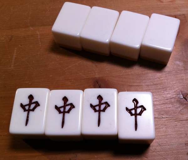 白牌と中牌で重いのは白牌か?…を(それぞれ4つの牌で)計ってみると、白牌が平均14.83245グラムで中牌が平均14.9636グラムでした*。なんと、絵柄を削り出してあるはずの中牌の方が(無柄の)白牌より0.28グラムほど重かったのです!