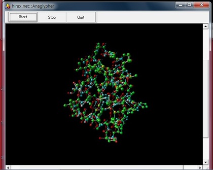 作ったソフトウェアは、ここに置いておいておきます。スタートボタンを押した後、(3秒以内に)3D AVS Playerのウィンドウをアクティブにしてやれば、そのウィンドウの描画内容に対してアナグリフ化を行います。