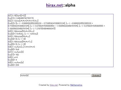 さて、実際に使ってみると、有料版Mathematicaでは使うことができても、Mathematica Player付属のカーネルでは使うことができない関数がいくつもあることに気づかされます。けれど、その一方で、方程式を解いたり・数値処理をする分には、実にたくさんの機能を使うことができることにも、同時に気付かされます。本家 "WolframAlpha"ほどではないにしても、WEBベースの数式演算処理サーバが稼働し始めるのは、なかなかに楽しいものです。