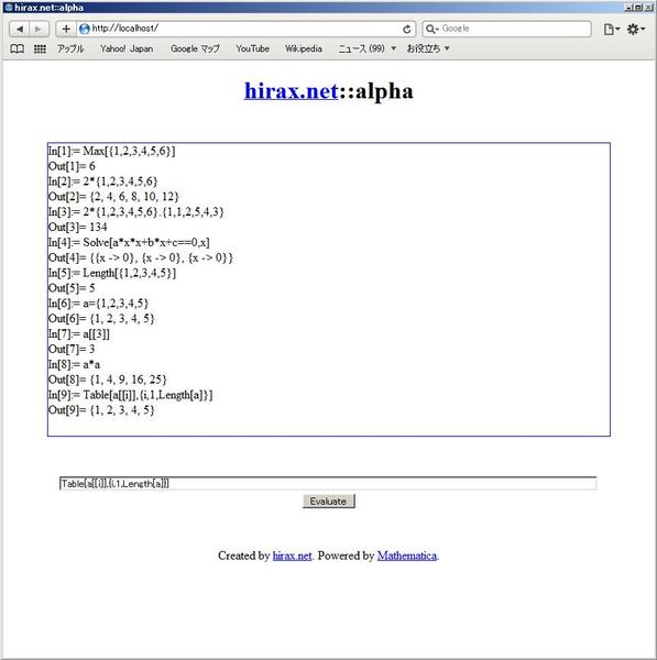この状態で、ためしにブラウザを立ち上げてhttp://localhost/にアクセスしてみましょう(たとえば、80番ポートで立ち上げたのでなく、81番ポートで立ち上げたのであれば、http://localhost:81/にアクセスしてみましょう。すると、ブラウザ上で下のスクリーンショットのような画面が現れ、あなたのブラウザ上でMathematicaを使うことができるようになります。入力も出力も、通常のMathematicaと同じような(似たような)画面構成ですから、Mathematicaを使ったことがある方であれば、簡単に使うことができると思います。