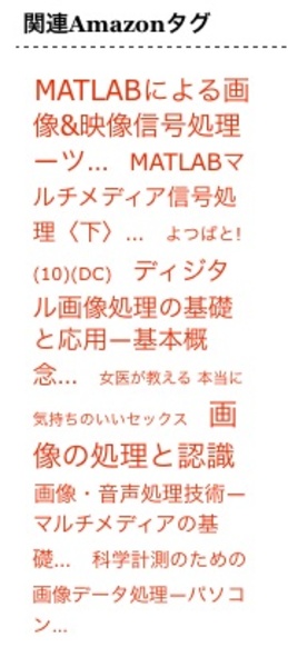 右に貼付けたのは、今の瞬間に表示されていた「関連Amazonタグ」です。多少の違いはありますが、「関連プロダクト」の方も同じような内容が表示されています。画像処理や信号処理キーワードが並ぶ中、少し趣が異なるキーワードがたまに顔を出す、という具合です。