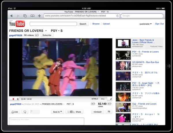 iPadでYouTubeを眺めようとする場合、Flashが搭載されていないために、試験的に提供されているHTML5を介してを眺めることになる。そうすれば、レンダリングのバランスが崩れている部分もあったりするけれども、普通にYouTubeを楽しむことができる。YouTubeに格納されている膨大な動画群は、ネットが持つ大きな資産なのだから、それらをiPadで楽しむためにはこのHTML5経由のYouTubeは欠かせない。もしも、HTML5経由でYouTubeを眺めることができなかったとしたら、iPadを使ってみようとも思えないくらいである。