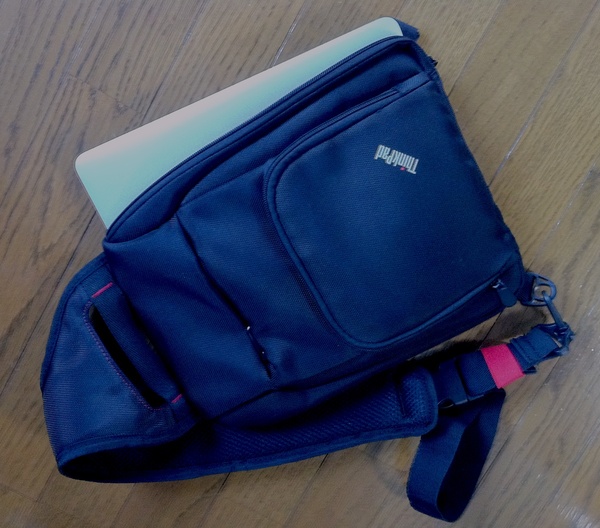 ThinkPad X100e Slingケースを買ってから、「このバックには、さぞ11インチ MacBook Airが似合うに違いない」と考えた途端、その想像を実現させたくてたまらなくなりました。それが原因で…言い換えればスリングバックに似合うノートPCが欲しくなり、11インチMacBook Airを買ってしまったのです。(一番理想的なのはOSXが動くThinkpad X61s SXGA+ 8GB RAM with SSDだったのですが現実世界では手に入らないマシンですから…)