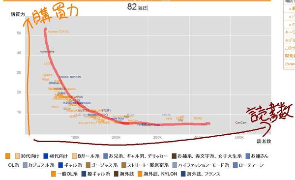 この分布図は「読者数が多い雑誌ほど読者の購買力が急激に少なくなる」というよりは、読者数が少ない雑誌は読者の購買力がとても高い、という方が正確かもしれません。読者数が多ければ読者の購買力が低くても雑誌は存続できるでしょうが、読者数が少ない雑誌は、読者の購買力が高くないと雑誌を刊行し続けることはできないでしょうからです。
