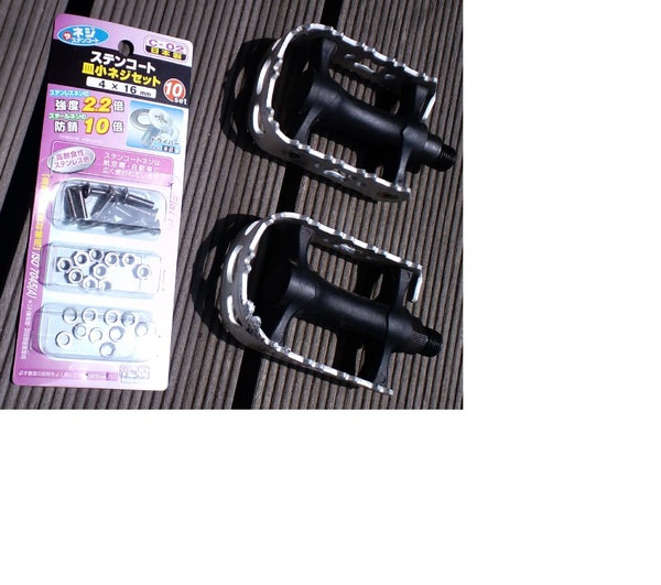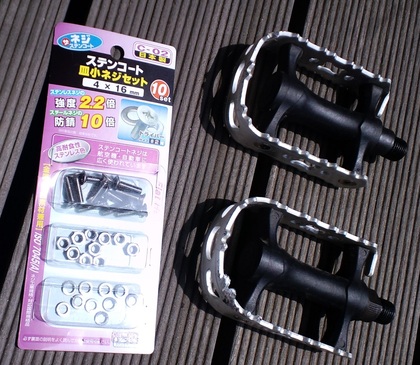 POWER GRIPSはそんな優れものなのですが、モノとしては単なる穴の開いたベルトとネジです。そして、その見た目の質素さにくらべて)少々値が張るので、自作"POWER GRIPS"モドキを作る人たちがいます(参考資料1参考資料2参考資料3参考資料4(最新版のPOWER GRIPSと同じように作るなら、リンク先で使っている金具は不要です))。必要な材料は、(普通の)ペダルに適当なベルト素材とネジだけですから、身の回りを探せば、買わずとも両方とも手に入りそうに思われます。あるいは、両方買ったとしても、100円ショップなら消費税込210円ナリで材料を揃えることができます。